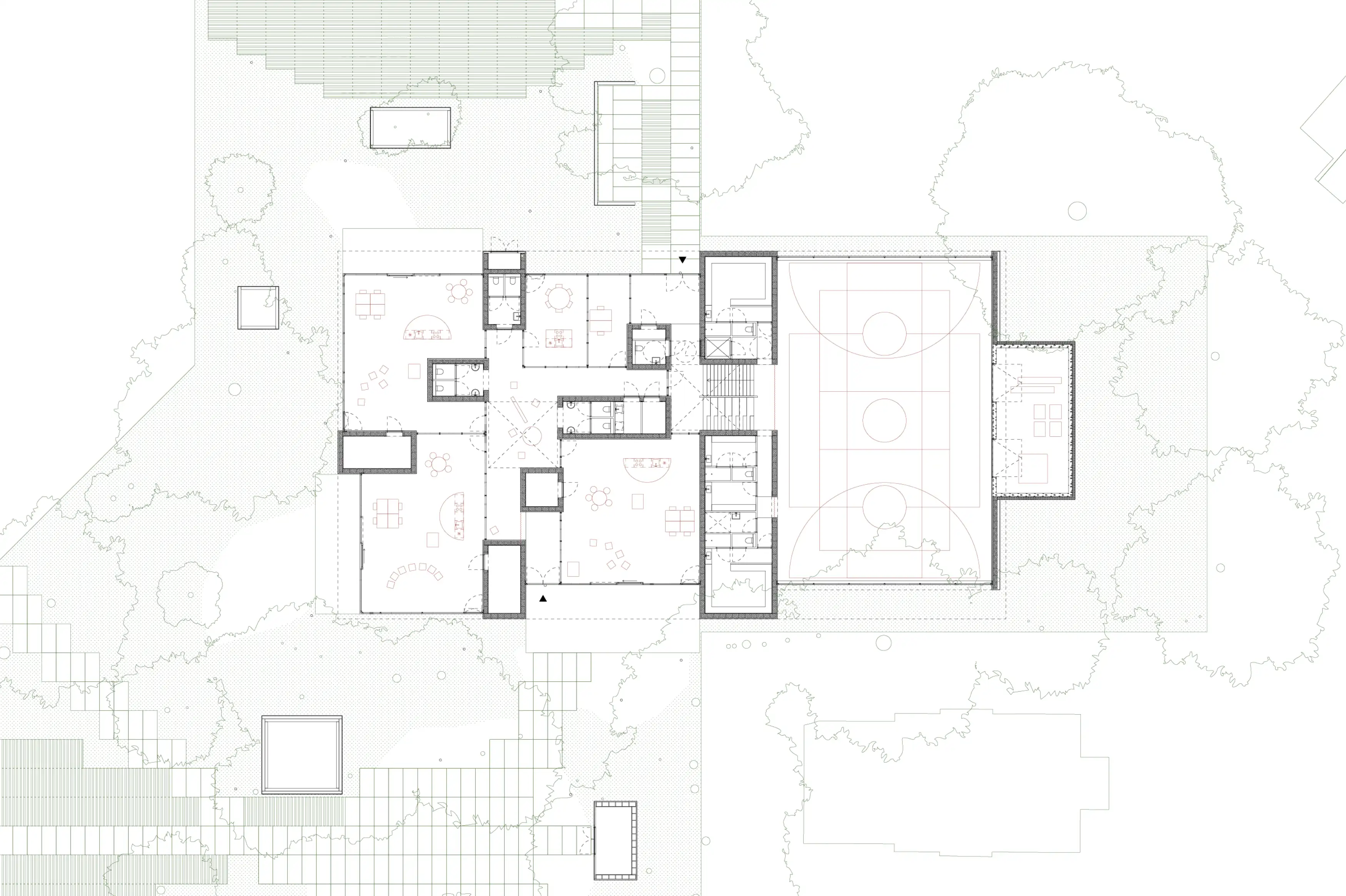 Space&Matter is designing a new after-school care center and gymnasium in a hidden garden plot in Zeist. Inspired by the surrounding wooded, sandy landscape, the design arranges a series of bold, timber-built volumes among the trees, blending indoor and outdoor spaces under a continuous four-meter-high roof. The partially sunken gymnasium and clear programmatic layout create a cohesive, sustainable, and nature-inclusive environment, where generous communal areas support both learning and play. Completion expected in 2028.