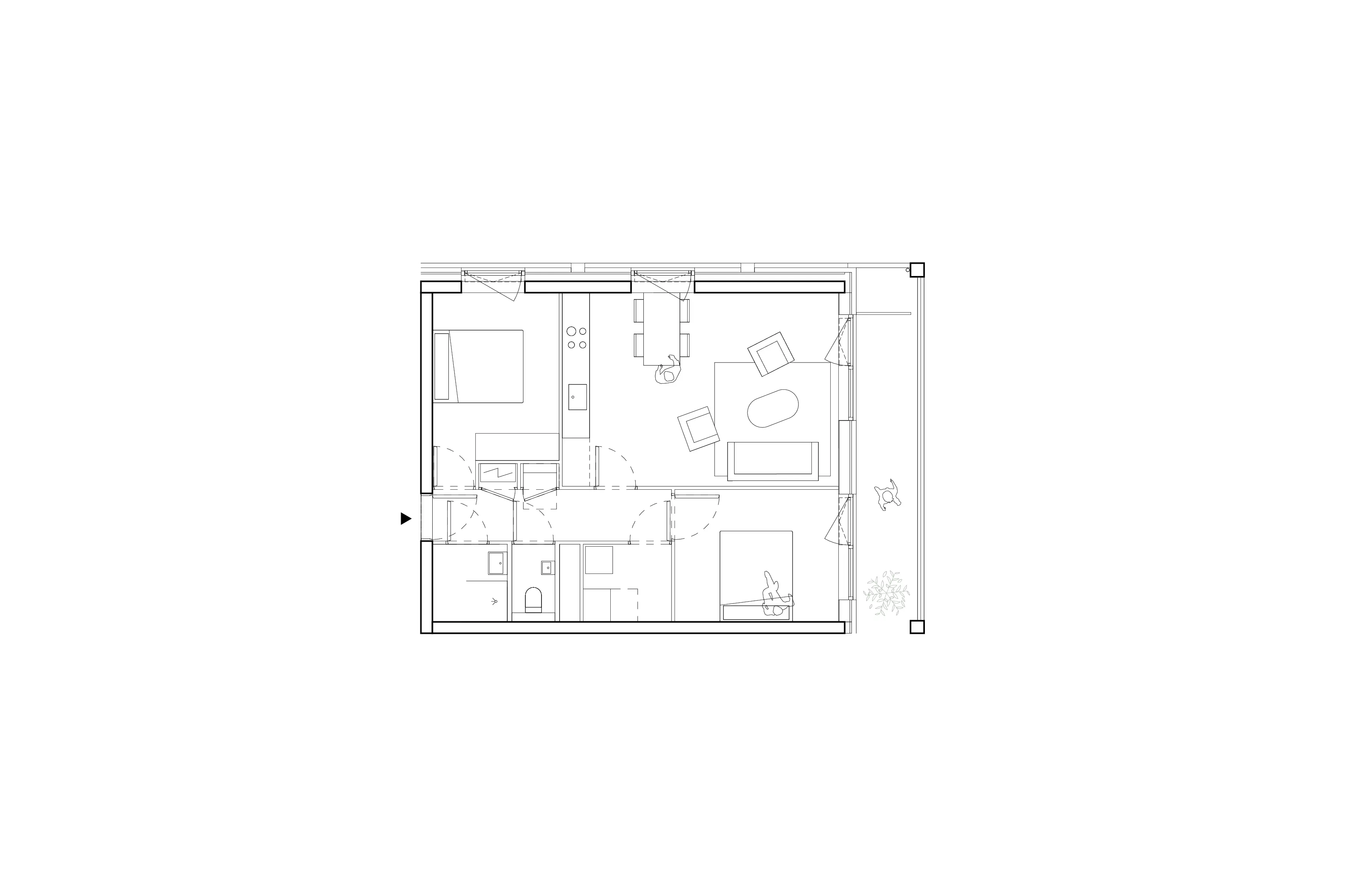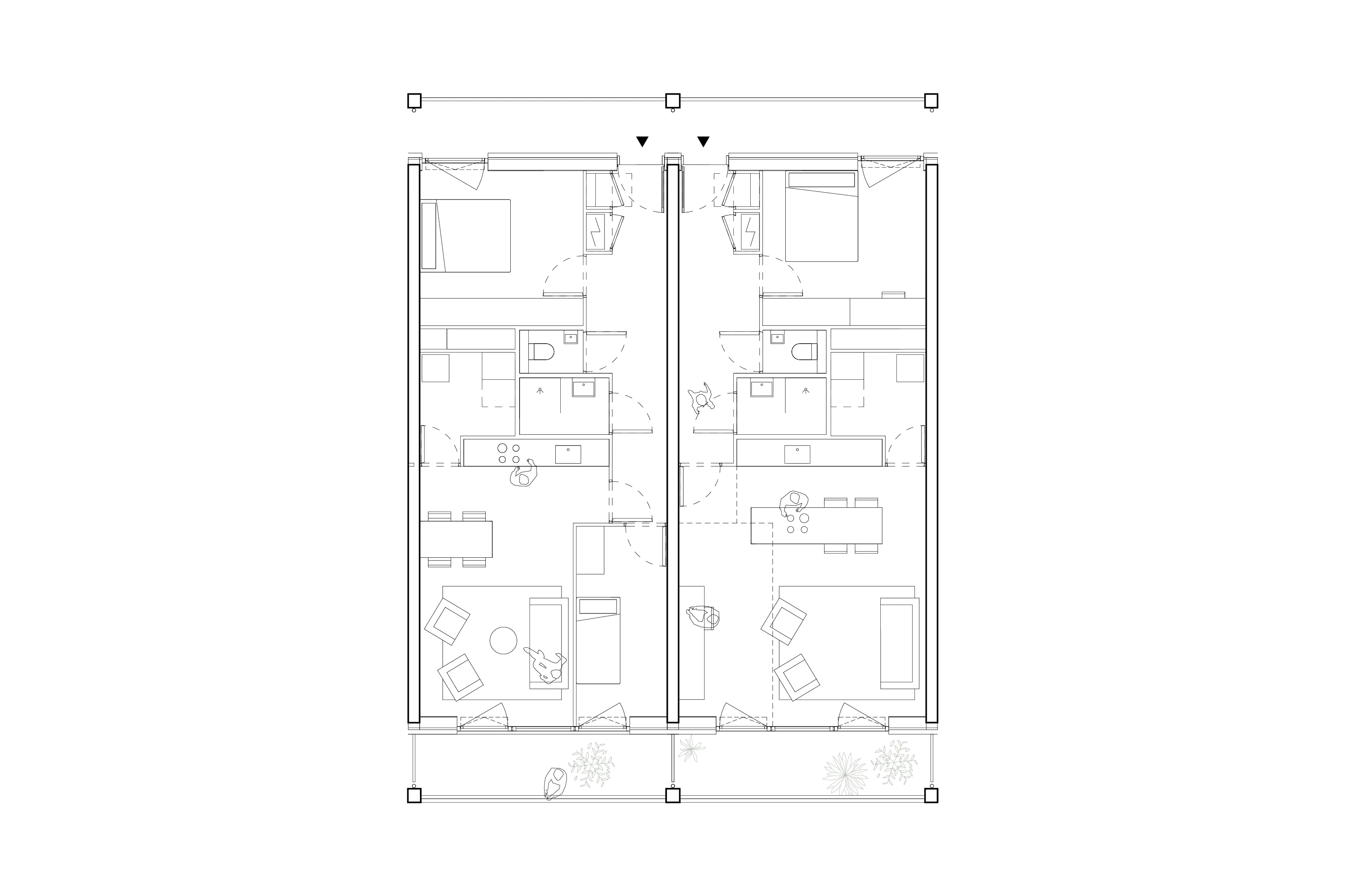 As part of the revitalisation of Neighbourhood E in the Bijlmer district in Amsterdam South-East, Space&Matter designs a residential building that reacts to the initial design ideals for the Bijlmer in 1966. A clear grid structure organizes the layout and circulation, creating a spatial framework. Within the grid, a network of in-between spaces — semi-public corridors, gardens, and roof terraces — acts as ground for encounters and informal social interaction. These transitional zones blur the boundaries between private and communal, emphasizing collectivity and a shared sense of place. The grid not only structures program but also supports layered planting and vertical gardens, encouraging greenery and biodiversity to flourish over time.