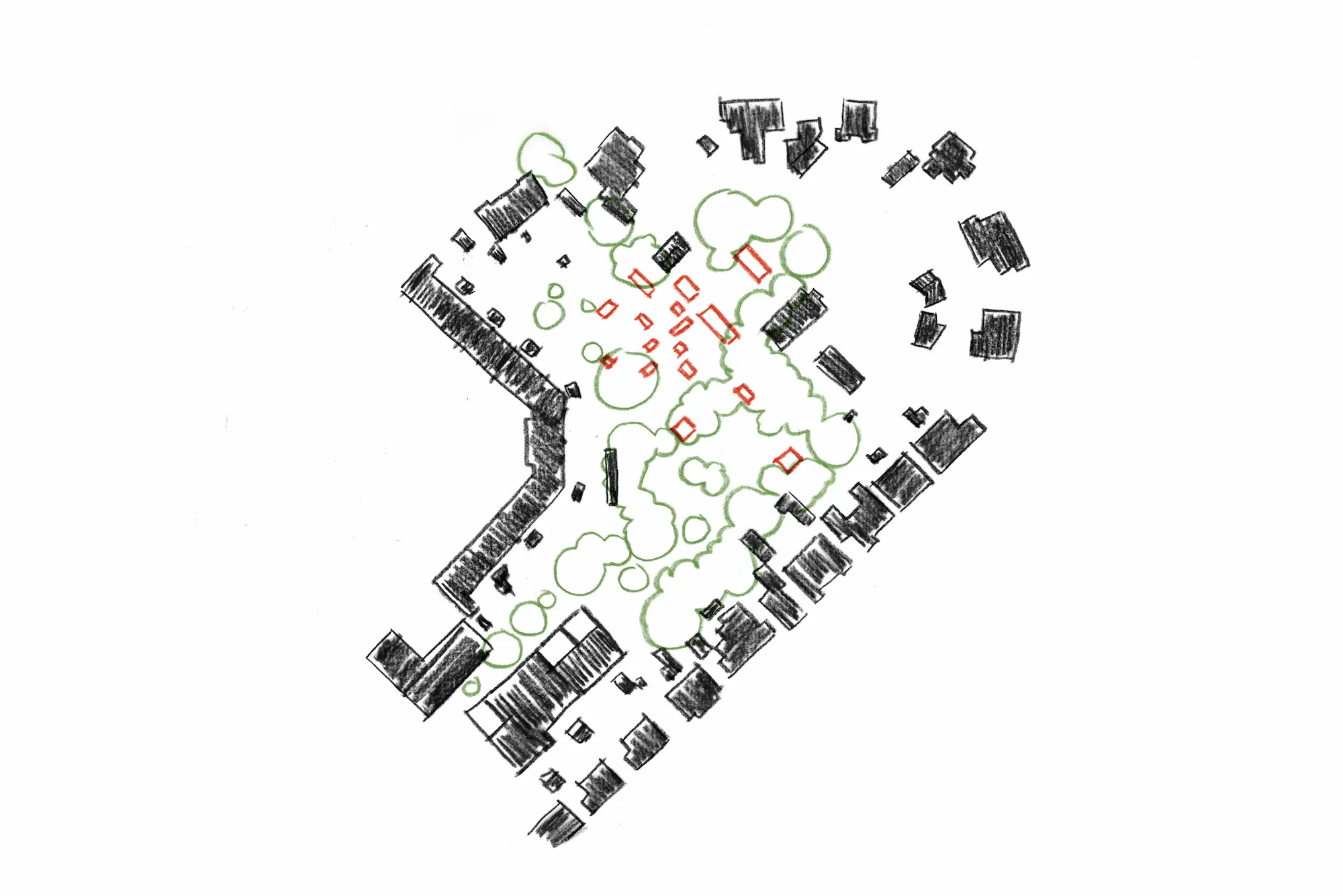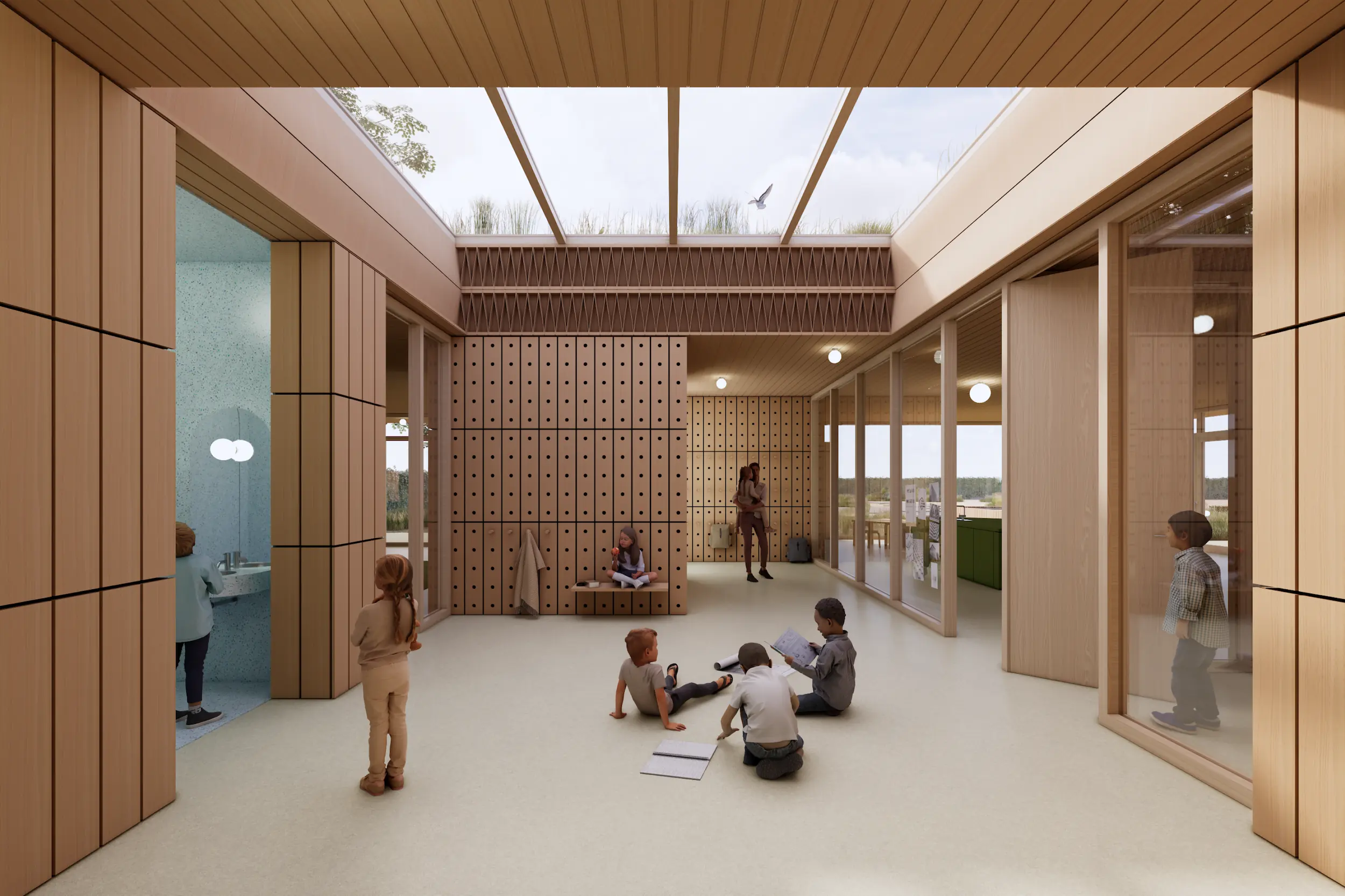 Space&Matter is designing a new after-school care center and gymnasium in a hidden garden plot in Zeist. Inspired by the surrounding wooded, sandy landscape, the design arranges a series of bold, timber-built volumes among the trees, blending indoor and outdoor spaces under a continuous four-meter-high roof. The partially sunken gymnasium and clear programmatic layout create a cohesive, sustainable, and nature-inclusive environment, where generous communal areas support both learning and play. Completion expected in 2028.